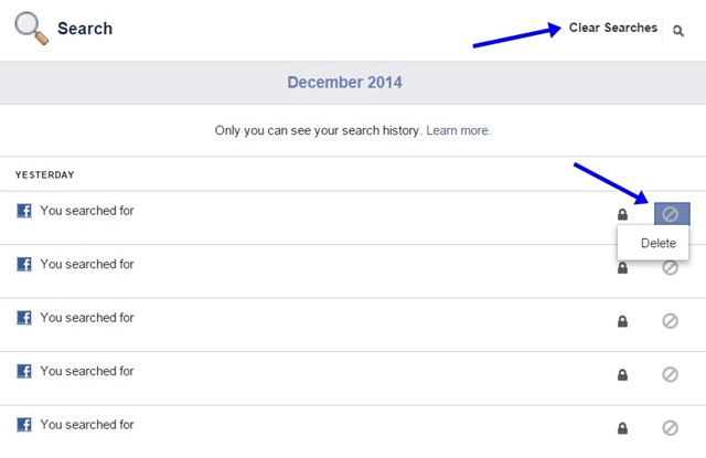 4. เลือกลบประวัติการค้นหาที่ต้องการด้วยการคลิกที่ปุ่ม Delete (ลบ) หรือถ้าหากต้องการลบล้างประวัติการค้นหาทั้งหมดให้คลิกเลือก Clear Searches (ล้างการค้นหา)