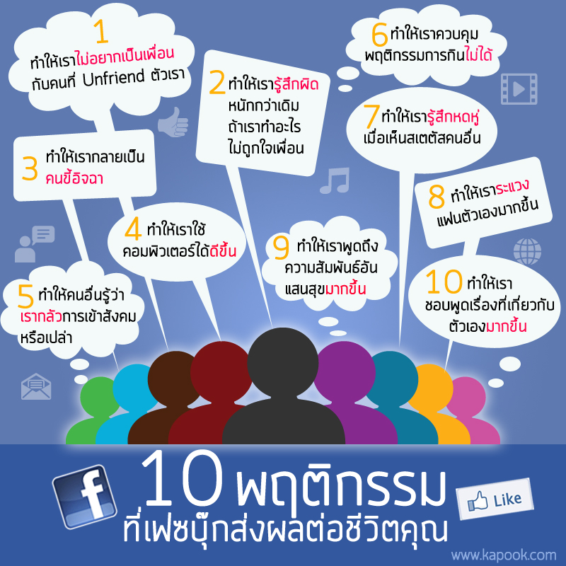 ในสังคมปัจจุบัน เฟซบุ๊กได้เข้ามาเป็นส่วนหนึ่งของชีวิตประจำวัน บางคนอาจต้องเช็กเฟซบุ๊กทุกวัน เพื่อดูว่า เพื่อน ๆ แต่ละคนไปไหน ทำอะไร หรือมีข่าวน่าสนใจอะไรบ้าง จนทำให้เฟซบุ๊ก กลายเป็นโซเชียลเน็ตเวิร์กขนาดใหญ่ ที่ครอบคลุมผู้ใช้หลายร้อยล้านคนทั่วโลก แต่การใช้เฟซบุ๊กมาก ๆ ก็อาจส่งผลต่อพฤติกรรมของเราได้เช่นกัน ลองมาดูกันว่า 10 พฤติกรรมที่เฟซบุ๊ก ส่งผลกระทบต่อเรา มีอะไรบ้าง